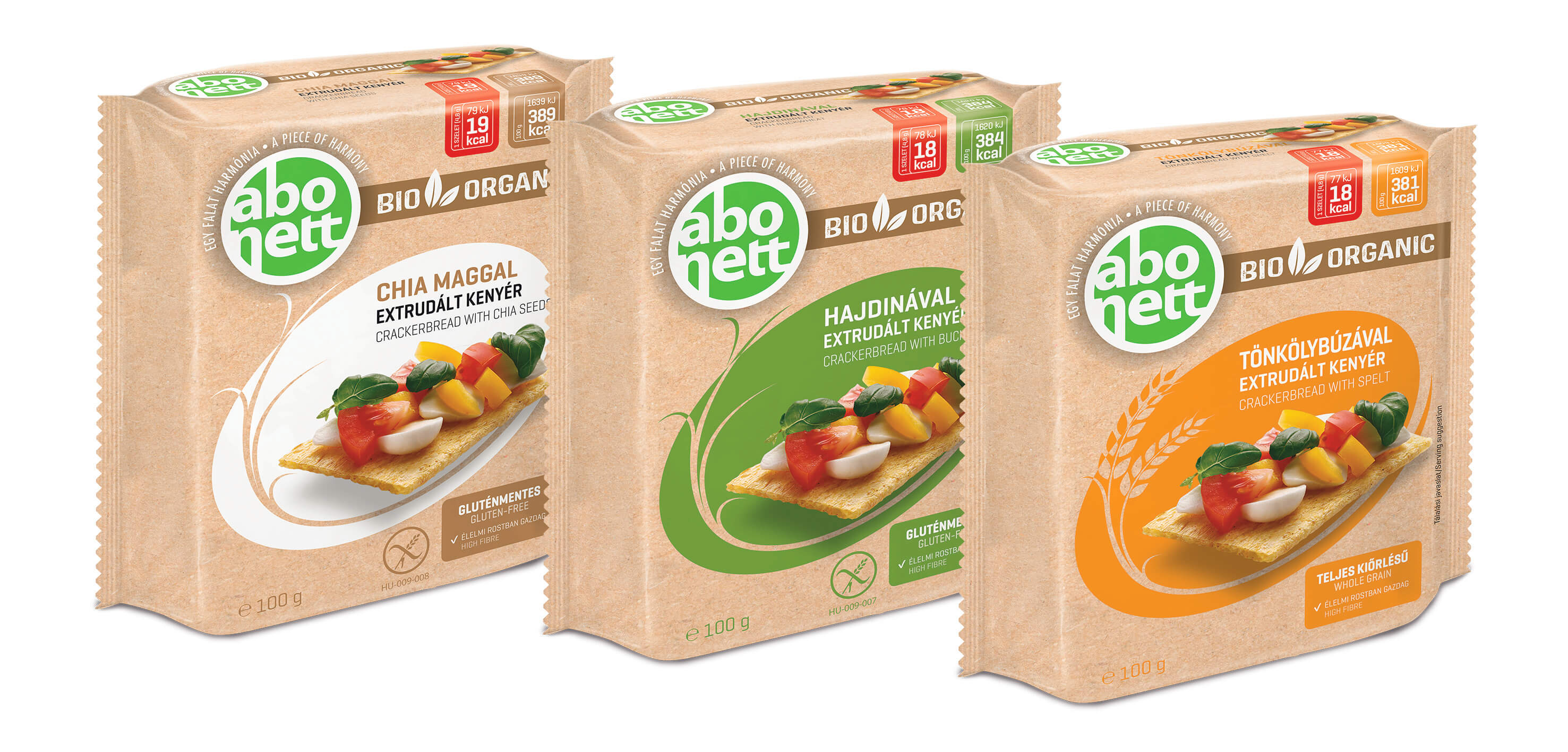 A BIO Abonett termékcsaládba tartozó tönkölybúzával, hajdinával és chia maggal extrudált kenyerek közül a két utóbbi íz egyben gluténmentes is.